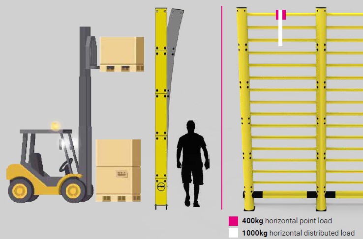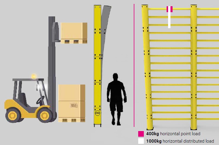 Esta versión combina la protección contra colisiones en su parte inferior con la protección contra la caída de objetos. Es ideal para áreas donde se utilizan vehículos y maquinaria.