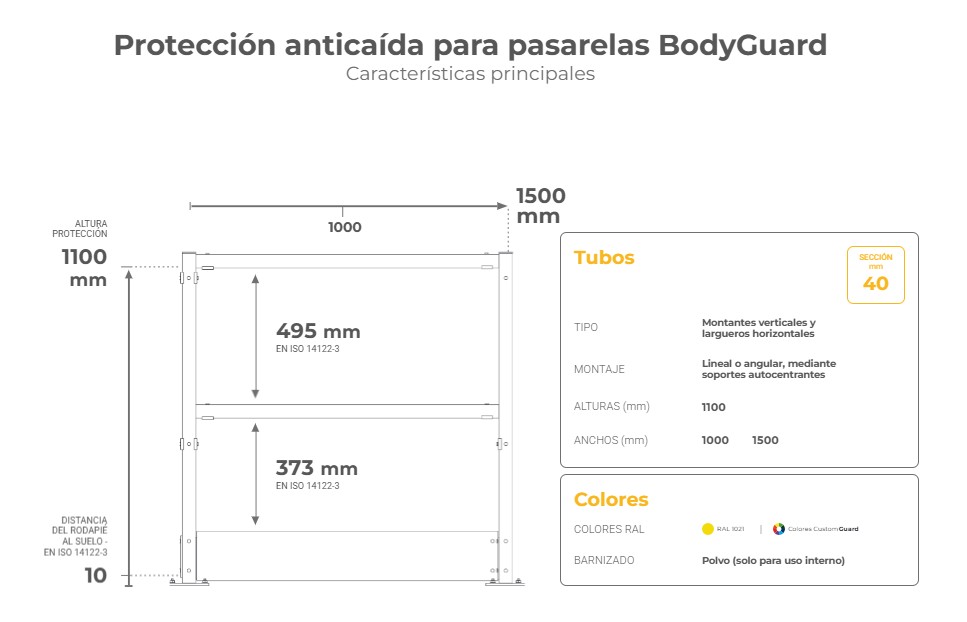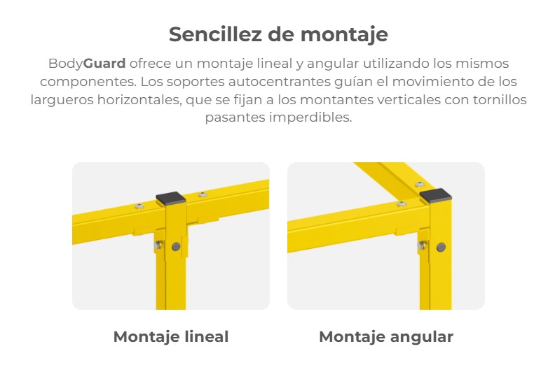RESISTENTE: La estructura ligera con montantes y largueros horizontales, más rodapié reforzado, hace del BodyGuard una solución ligera y resistente para la seguridad de los operarios.