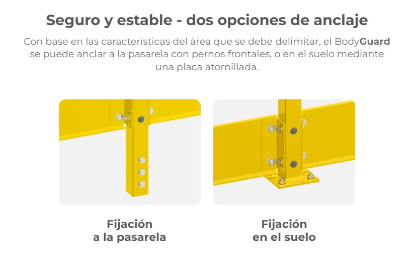 BodyGuard es el sistema de protección anticaída para pasarelas o para delimitar trayectorias en el suelo. Compuesto por montantes verticales y largueros horizontales, se puede fijar al suelo con una placa o a la pasarela con pernos frontales. BodyGuard protege al operario en estaciones de trabajo, zonas de mantenimiento o accesos a maquinaria. Combina barreras físicas con buena visibilidad y ergonomía, sin interferir en la operación. Su diseño compacto permite reforzar la seguridad en puntos de intervención manual o aperturas temporales.