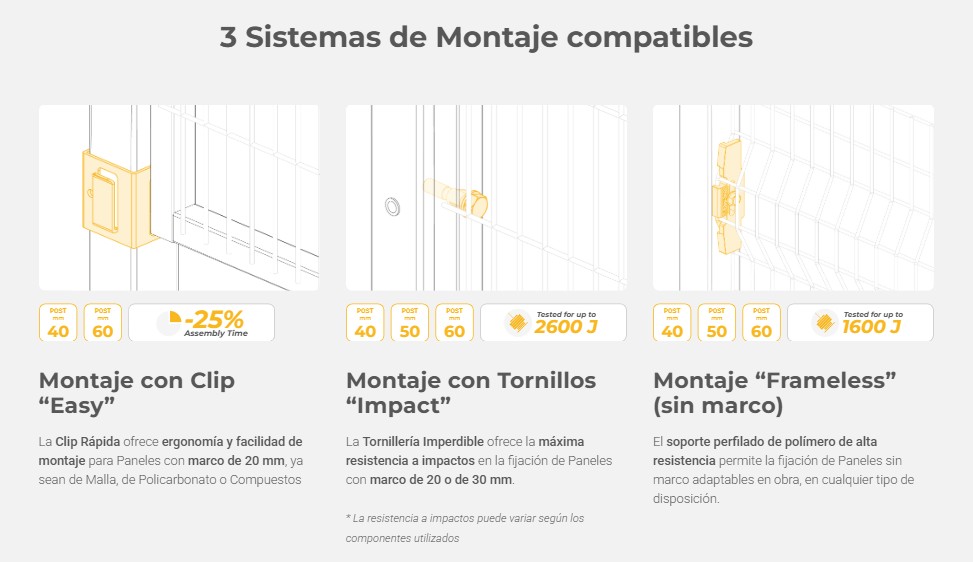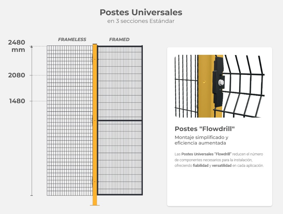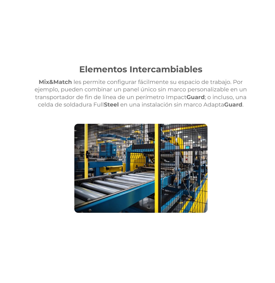 Con la intercambiabilidad de componentes y los postes Mix&Match los sistemas Satech se vuelven cross-modulares. La solución más ágil y flexible para adaptar un layout de vallados perimetrales a las necesidades únicas de cada planta. Un paso adelante en la optimización y personalización de los espacios de trabajo industriales, capaz de simplificar la instalación y reducir los costos operativos. Mix&Match de Satech permite crear soluciones de protección personalizadas combinando componentes estándar. Su enfoque modular y flexible facilita el diseño eficiente de barreras que se adaptan a diferentes entornos industriales, garantizando alta seguridad y cumplimiento normativo.