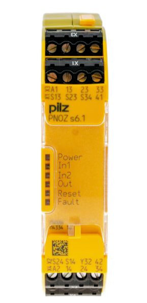 Relé de seguridad PNOZsigma (Standalone). Entradas: Cableado de 1/2 canales con / sin detección de cortocircuitos en los contactos. Salidas: 2N/O, 1 semiconductor, UB 24 V DC, ancho: 17,5 mm, terminales enchufables con resorte. Monitoreo E-STOP, puertas de seguridad.